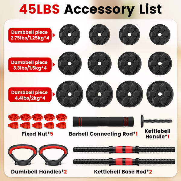 【Free Choice of Weight】The weight set's detachable design increases the flexibility of use. the single dumbbell is adjustable from 5-22 lbs, barbells: 8-47 lbs, and kettlebells: 5-23lbs. Effectively meeting your different exercise needs during various stages.Installation is simple.