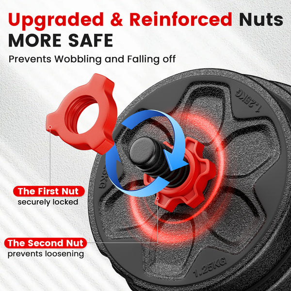 【High-Quality Safety Double Nuts】This adjustable dumbbell set includes four safety double nuts. The thickened threads on the nuts effectively keep the weight plates secure, double nuts design preventing movement or shaking during workouts. This ensures your safety and provides a stable exercise experience.